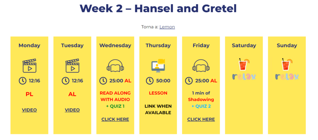 Queste settimane sono incentrate su temi specifici, presentati tramite video o podcast coinvolgenti. L’obiettivo è immergerti in argomenti di vita quotidiana, cultura e attualità , migliorando il tuo vocabolario e la tua capacità di comprendere l’inglese parlato.