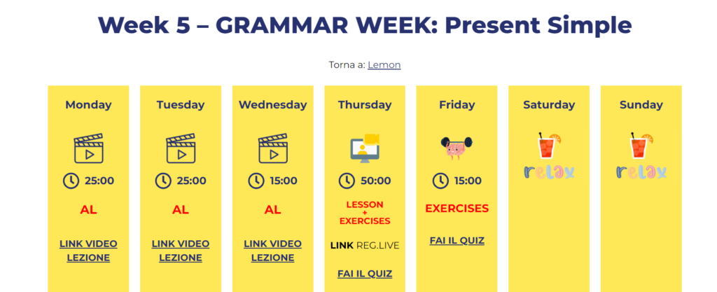 Settimane dedicate interamente a un argomento grammaticale specifico. Questi momenti di focus ti permetteranno di approfondire le regole della lingua in modo mirato e strutturato, consolidando le tue competenze grammaticali per una comunicazione piĂą fluida e corretta.